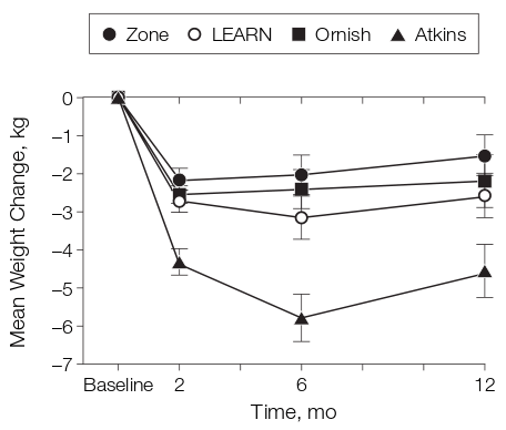 Como parte del gran engaño que es la teoría del balance energético, encontramos las dietas hipocalóricas. Estas dietas han fracasado sistemáticamente en la vida real y en los estudios científicos, pues, tal y como muestra la curva verde de la gráfica, hacen perder algo de peso a corto plazo (en media no llega a los 10 kg), pero con el tiempo la pérdida de peso desaparece y comienza una fase de recuperación del peso perdido. No es que se recupere muy deprisa, pero al cabo de 3 ó 4 años la pérdida de peso ronda los 4 kg (ver,ver,ver):