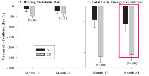 En cualquier caso, como curiosidad, en este artículo se detalla que en este mismo experimento el gasto energético total estaba —como en realidad era de esperar— más reducido «de lo esperado» (la barra gris en el recuadro rojo en la siguiente gráfica muestra la diferencia entre la reducción real del gasto energético y la esperada, a ojo unas 150 kcal/d menos de lo previsto), y se confirma lo que ya sabemos de otras veces, que ese efecto no suele manifestarse en la tasa metabólica en reposo (parte izquierda de la gráfica, barra gris en el mes 24) (ver,ver,ver,ver)