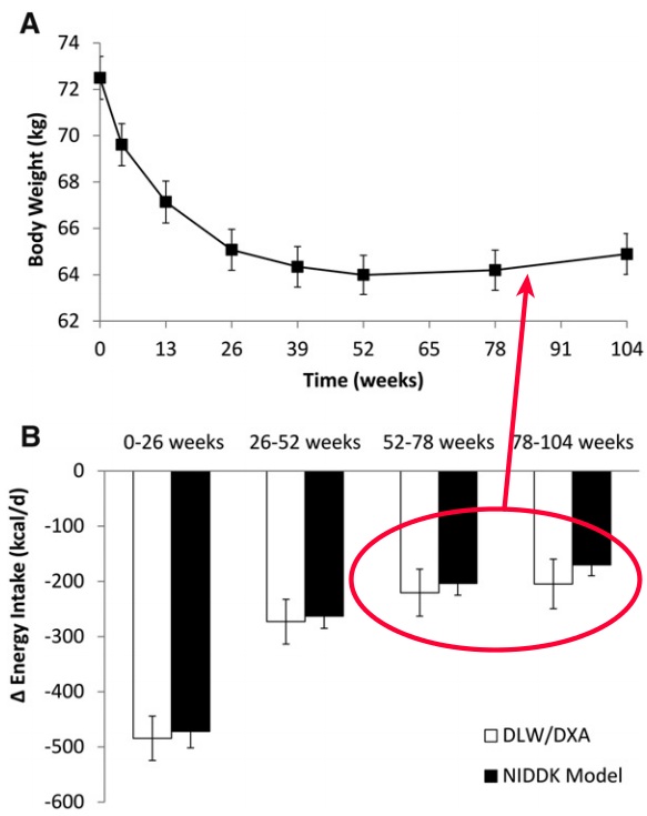 Desde el punto de vista de la pseudociencia del balance energético, si hay una reacción fisiológica de 50 kcal, si comes 50 kcal menos vas a compensar el efecto fisiológico. Pero entender lo que está pasando requiere conocer la causalidad: si la causa de la adaptación fisiológica fuera una ingesta excesiva, reducir la ingesta haría desaparecer la reacción y el peso se mantendría estable. Pero la causa de esa reacción no es comer «de más», más bien al contrario, puede que esté causada por bajar de peso «comiendo de menos», es decir por adelgazar pasando hambre. Si confundimos el gasto energético, un síntoma, con la causa de recuperar el peso, no evitaremos la reacción.