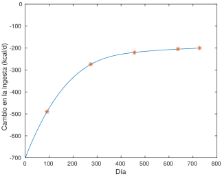 Asumo en lo sucesivo que estos son los datos de ingesta diarios (respecto del origen de tiempos, que se supone punto de equilibrio ingesta-peso):