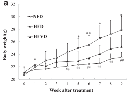 Experimento en ratones, interesantísimo. Tenemos dos dietas, una con contenido bajo en grasa (grupo NFD) y una con alto contenido en grasa (grupo HFD). Ya sabemos que a lo que llaman «alto en grasa» en los experimentos con roedores en realidad suele ser «alto en grasa y en azúcar» y esas dietas suelen ser más engordantes que el chow normal a igualdad de calorías (¡viva el balance energético!). En el experimento, a parte de los ratones que siguen dieta alta en grasa les suministramos vitamina D (grupo HFVD).