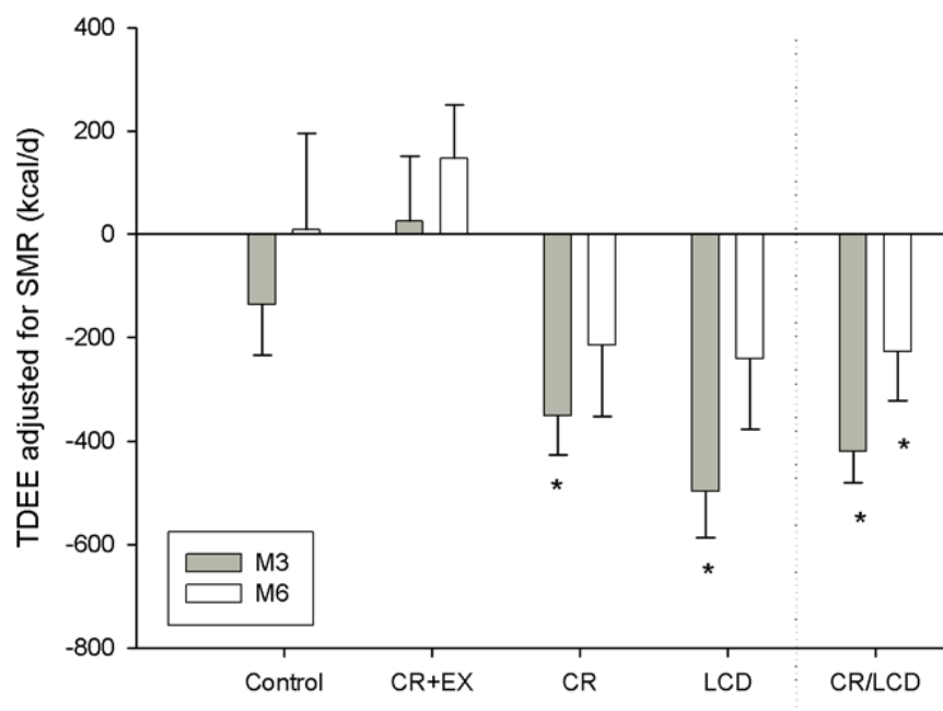 «TDEE adjusted for body composition, was significantly lower by -431±51 and -240±83 kcal/d at M3 and M6, respectively, indicating a metabolic adaptation.»