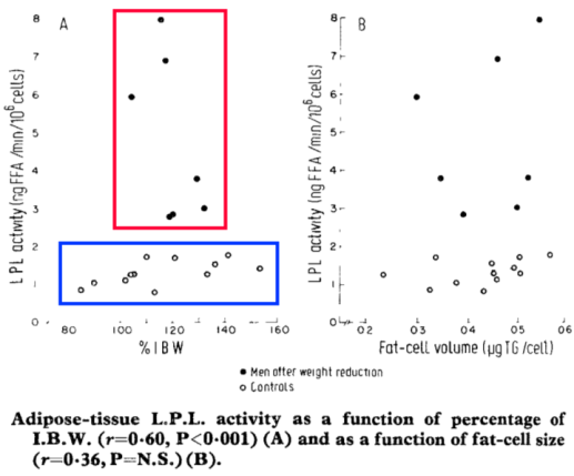 Insisto nuevamente en algo realmente importante: la gráfica dice que tras la restricción calórica la LPL está más activa que en personas del mismo peso que no han adelgazado. Y los autores sugieren que esta desproporcionada activación de la LPL puede estar detrás de la recuperación de la grasa corporal en las personas que han adelgazado, haciendo que sus células grasas recuperen el tamaño que tenían en el estado obeso: