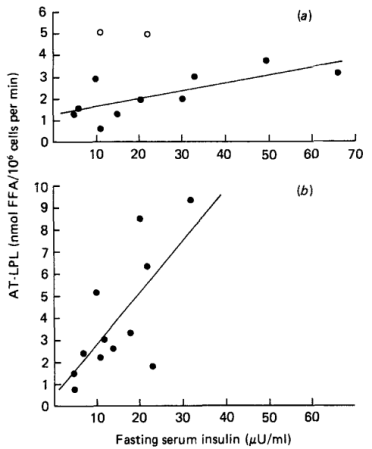 the correlation between AT-LPL activity and serum insulin was r 0.71 (P < 001) and the slope increased to 0.23. This line includes the two individuals who were ‘outliers’. This could suggest a change in the sensitivity of AT-LPL activity to insulin with weight loss.