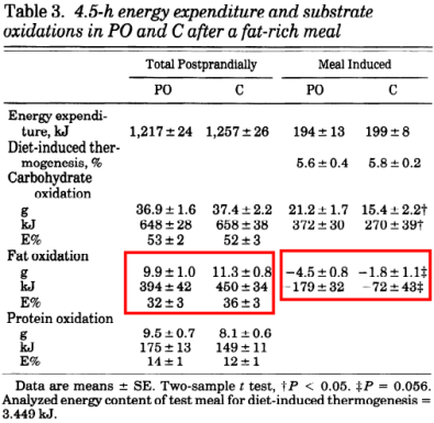 Como vemos en la tabla, la tasa de oxidación de grasa de las participantes post-obesas (PO) estaba reducida respecto de las participantes control (C) en el periodo postprandial: