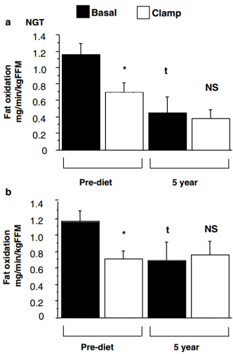 At 5 y, basal fat oxidation was significantly lower compared to prediet in both NGT and DM groups (0.4570.19 vs 1.1670.14 mg/min/kg fat-free mass (FFM), P ¼ 0.03; 0.6970.21 vs 0.1770.10 mg/min/kg FFM, P ¼ 0.03 respectively).