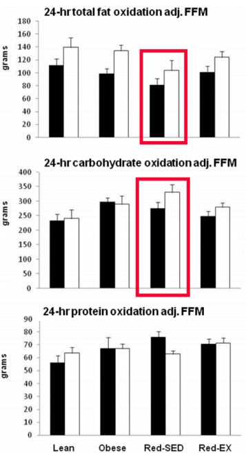 La gráfica muestra una reducción de la oxidación de grasa (y aumento de la de carbohidratos) por unidad de masa no grasa en post-obesos sedentarios, en comparación con obesos y delgados. Sin embargo, esa reducción no es tan acusada en post-obesos que afirman ser activos físicamente (Red-EX).