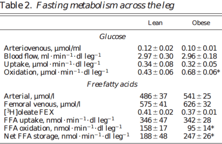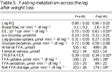 Tras perder unos 15 kg y mantenerlos durante un mes, las tasas de absorción de ácidos grasos y de oxidación de grasas en el músculo esquelético estaba muy reducida respecto del estado de obesidad y respecto de individuos delgados.