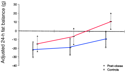 A number of human studies have also demonstrated that weight-stable formerly obese subjects have lower fasting or 24-h rates of fat oxidation compared with matched control subjects, or an impaired ability to appropriately increase fat oxidation in response to a high-fat diet
