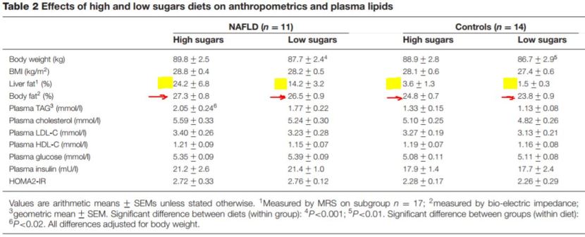 En la tabla podemos ver el diferente efecto de las dos dietas en el contenido en grasa del hígado y en la grasa corporal. Se muestran los resultados por separado según si los participantes tienen hígado graso no alcohólico (NAFLD) o tienen un hígado sano: