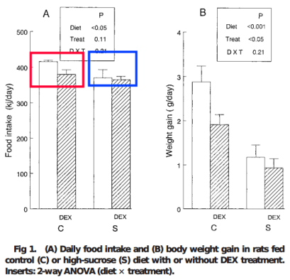 NOTA: si con la misma ingesta energética la ganancia de peso corporal ha sido menor, supuestamente el gasto energético ha tenido que ser mayor, pero los autores del estudio argumentan lo contrario, que el glucocorticoide reduce el gasto energético.