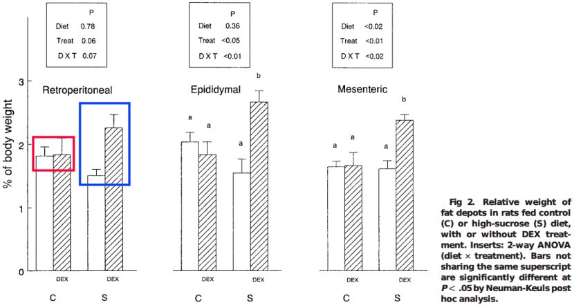 Mismas calorías, misma dieta, y un grupo ha acumulado claramente más grasa corporal que el otro. Y la pseudociencia del balance energético no puede explicar nada, porque, de hecho, los grupos tratados con el glucocorticoide ganaron más grasa corporal pero menos peso corporal.
