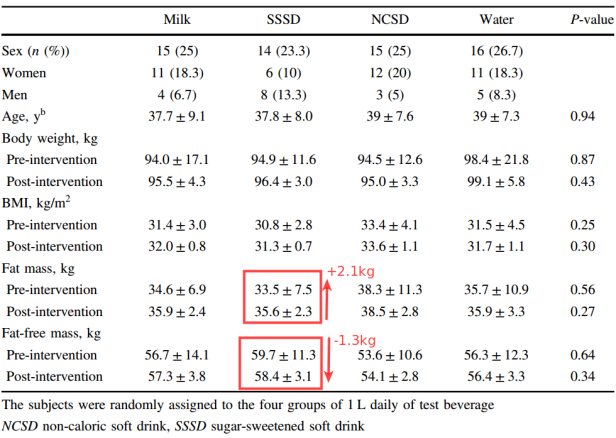 El grupo que bebía bebida azucarada ganó 2.1 kg de grasa corporal y perdió 1.3 kg de masa no grasa. Sin cambios notables en el grupo que bebía agua.