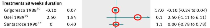 Aparte del hecho de que 2 de los 3 estudios no deberían estar en el metaanálisis, llama muchísimo la atención el peso asignado a los mismos. Es habitual usar la inversa de la varianza como medida de fiabilidad y asignar un peso a los estudios proporcional a la inversa de la varianza. De esa forma los resultados de estudios con pocos participantes suelen tener menos peso en el total de un metaanálisis que estudios con más participantes. Parece razonable, ¿verdad? Pero en este metaanálisis el estudio de Grigoresco et al., con sólo 8 participantes, tiene asignado un peso 170 veces mayor que el de Osei et al., que tiene 13 participantes y tres veces más duración. ¡¡¡170 veces mayor!!! ¿Tan fiable es un estudio con sólo 8 participantes y dos meses de duración? Como consecuencia de estos sorprendentes pesos, el estudio de Osei et al. es, a efectos prácticos, como si no estuviera y el global de la comparación es básicamente como considerar sólo el de Grigoresco et al..