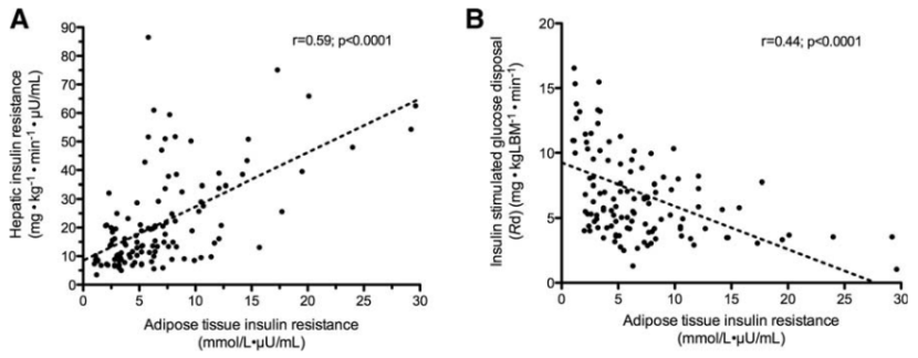 - Parte izquierda: resistencia a la insulina en el tejido adiposo frente a la resistencia a la insulina hepática y