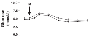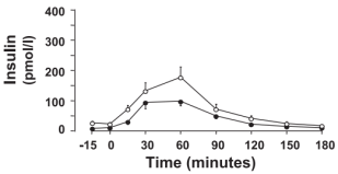 Algo que no nos debe engañar de la gráfica anterior es que ésa no es la insulinemia que han tenido ambos grupos dietarios durante el experimento: es su respuesta a una bebida de test que es idéntica para ambos grupos. Es decir, estamos comparando la respuesta ante una «comida» idéntica, no estamos comparando sus niveles hormonales durante todo el experimento con la dieta específica de cada grupo. Es decir, perfectamente uno de los grupos ha podido tener niveles de insulina postprandiales mucho más elevados que el otro, día tras día, porque la composición de la dieta era diferente.