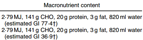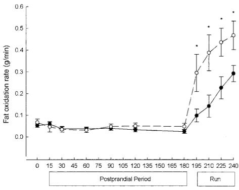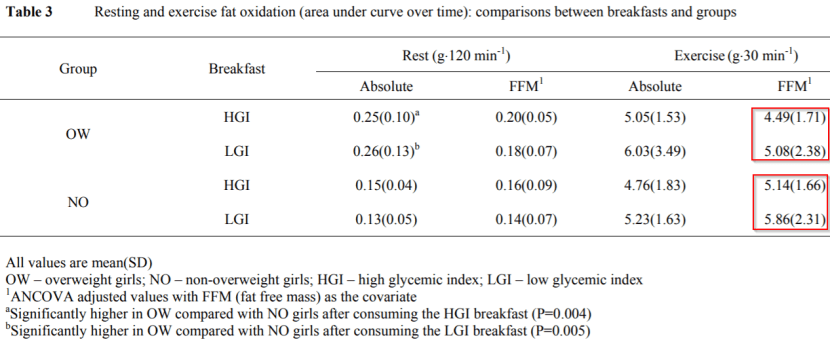 ambas comidas de carbohidratos antes del ejercicio dieron como resultado tasas más bajas de oxidación de grasas durante el ejercicio posterior que cuando los sujetos realizaban ejercicio en ayunas. Sin embargo, la comida de bajo índice glucémico resultó en una mayor tasa de oxidación de grasas durante el ejercicio que después del consumo de la comida de alto índice glucémico.