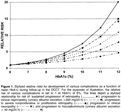 En este otro artículo (comentado en esta entrada del blog) se muestra la prevalencia de complicaciones según el nivel de hemoglobina glicosilada (HbA1c), es decir en relación con el mal control de la glucemia: