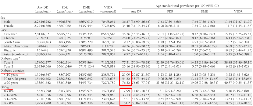 La prevalencia de la retinopatía diabética (complicación ocular que puede deteriorar la visión y es posible causa de ceguera) es altísima entre las personas que padecen diabetes tipo 1. La prevalencia crece con la HbA1c y con los años que se ha padecido la enfermedad:
