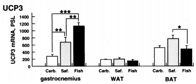 Although the average energy intake of mice fed each diet was not significantly different (data not shown), compared with carbohydrate fed mice, safflower oil fed mice showed a 2-fold increase of body weight gain (p<0.001) and a 2.6-fold increase of WAT weight (p<0.001). However, compared with safflower oil fed mice, fish oil fed mice did not develop obesity; body weight gain decreased by 58% (P<0.001), and WAT weight also decreased by 74% (P<0.001).
