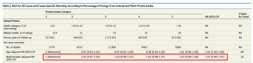 Tabla de datos del artículo en revista científica: el HR en mortalidad por cualquier causa no pasa de 1.03 en ningún quintil de consumo de proteína animal