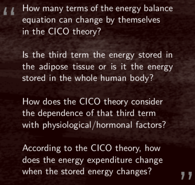 La teoría CICO es incorrecta en el plano teórico, ya que al no considerar la dependencia de la fisiología de uno de los términos del balance energético niega de forma injustificada la posibilidad de que ese tejido crezca/decrezca por sí mismo. Esto crea una falsa causalidad en el cuerpo humano. Además, no es posible hablar del tejido adiposo cuando se emplea la ecuación del balance energético en todo el cuerpo. El rigor no es un capricho.