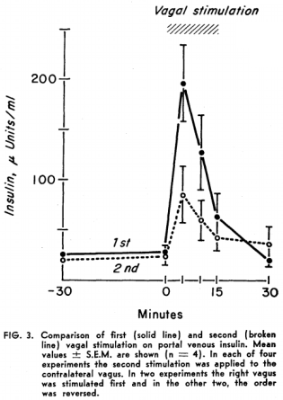 Después de la vagotomía, ocurre una caída en los niveles de insulina de la vena portal. Después de la estimulación del vago derecho e izquierdo, los niveles de insulina aumentan abruptamente, alcanzan el máximo en cinco minutos y vuelven rápidamente a los niveles basales.