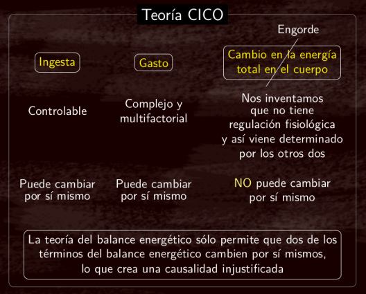 1. La teoría CICO, la idea de que engordamos porque comemos más de lo que gastamos, NO ES LA PRIMERA LEY DE LA TERMODINÁMICA. Está explicado en numerosas entradas del blog (ver,ver,ver,ver,ver), por ejemplo ésta: