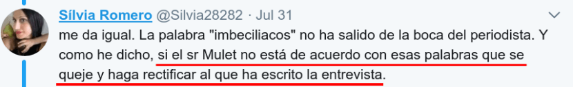 Le preguntaron en twitter si había pronunciado la frase, si había usado la palabra «imbeciliacos», o si por el contrario la periodista se lo había inventado. Y no contestó. ¿Por qué no contestó? ¿Era suya o no era suya la frase? Nuevamente, parece sencillo contestar a las preguntas y aclarar a quién insultaba.