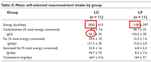 Según mis cálculos, si no existieran esos tres participantes, la pérdida de peso media de los 13 participantes restantes en el grupo LC sería 6.8 kg. Sigue siendo mayor que los 4.1 kg perdidos en el otro grupo. Y tengamos en cuenta la clara diferencia en la ingesta en ambos grupos.