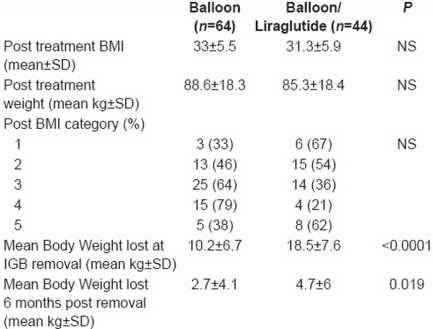 El liraglutide hizo perder más peso a los 6 meses y más peso a los 12 meses, pero el pronóstico fue peor que simplemente usar el balón intragástrico, pues aunque se había bajado más peso en los primeros seis meses (-16 vs -10 kg), se estaba recuperando más deprisa en los siguientes seis meses (+14 kg vs +7 kg). Los autores del artículo concluyeron, tras considerar otras características de los participantes, que era incluso contraproducente usar el fármaco.