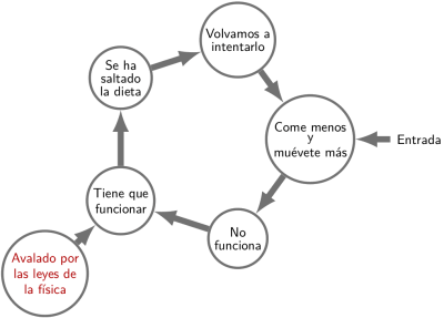 - Se interpreta el fracaso de la dieta como fracaso de la persona. Esto está implícito en el paradigma CICO, por lo que es inevitable. Se redefine la obesidad como un problema de comportamiento, un «descontrol de los impulsos» (ver). No haces lo que sabes que tienes que hacer. No importa que se diga que no se ha de culpar a la persona, pues en el paradigma caloréxico se la culpa. Si se cree que CICO es una ley inviolable, los argumentos que tratan de exculpar a la víctima no son creíbles (ver).