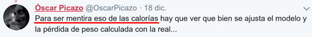Y, nótese que aunque el señor Picazo diga «peso» en realidad dice «tejido adiposo». Porque CICO no se usa con los cambios en el peso causados por ningún otro tejido concreto. Si ganas peso porque un tumor que tienes está creciendo, ¿afirmas esto?