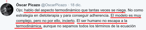 Óscar Picazo insiste en afirmar que CICO es complejo pero correcto y que criticar CICO es lo mismo que decir que el ser humano escapa a la termodinámica (ver):