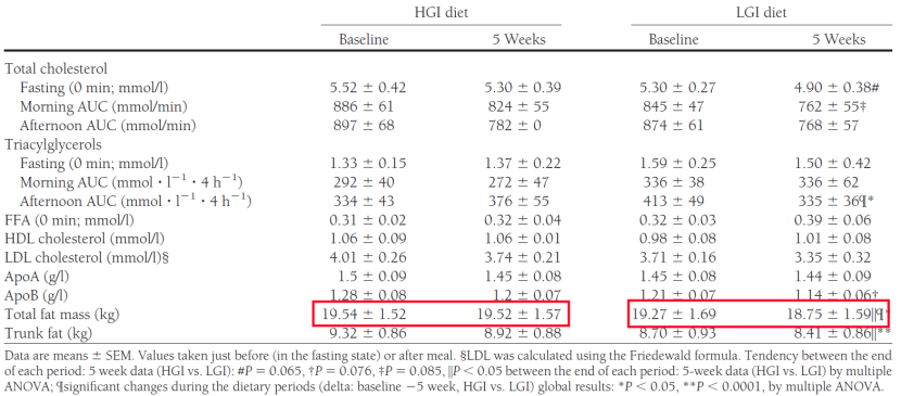Los autores del artículo resaltan la gran diferencia en las dietas altas en carbohidratos, casi el doble grasa perdida por reducir el índice glucémico, dicen: