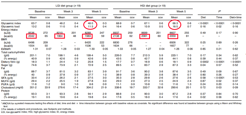 The subjects of the LGI diet group did not lower their energy intake significantly more than those in the HGI diet group.