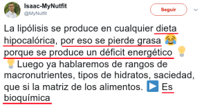 Isaac González tiene claro que si una dieta funciona es porque reduce las calorías que consumes. Mágicamente el cuerpo detecta el «déficit calórico» y mágicamente eso activa la lipólisis. Y nos dice que sus creencias son «bioquímica» 🙂