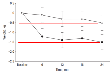 Pero eso no es nada: en términos absolutos el grupo de intervención logró perder 1.25 kg en los primeros 6 meses, y ¡¡¡¡mantuvo esa pérdida hasta finalizar el periodo de 2 años!!!!