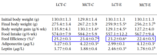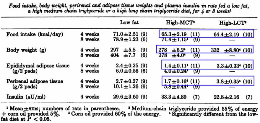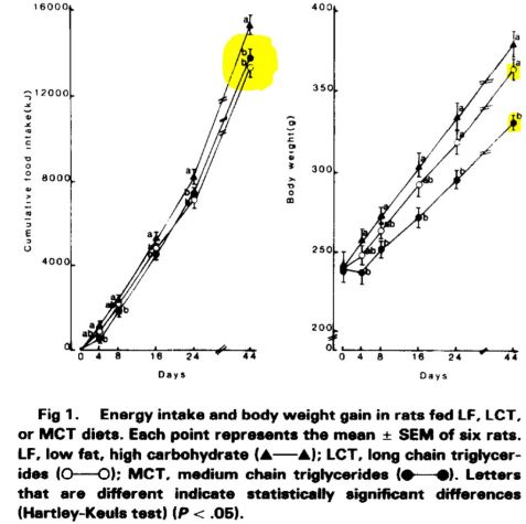 Energy intake was similar in the LCT and MCT groups […]. The weight gain of rats fed MCT diet was 30% less than that of rats fed LF or LCT diets.