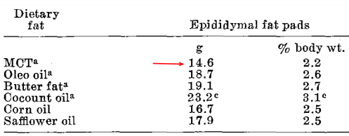 The high fat diets affected body weights in opposite ways according to the length of their triglyceride fatty acids: corn oil (LCT) significantly increased body weight while MCT significantly decreased it, as compared to the low-fat diet. The effect of the high fat diets on adipose tissue weights paralleled their effect on body weight; fat depots were enlarged by the high-LCT diet and were reduced by the high-MCT diet relative to the low-fat diet. MCT feeding versus low-fat diet feeding significantly reduced the weight of epididymal and perirenal adipose tis sues after 4 weeks.