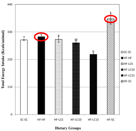 En la segunda parte del experimento, a parte de los ratones los cambiamos a diferentes dietas, identificadas por la segunda parte del nombre del grupo. Sólo el grupo SC-SC ha mantenido siempre la dieta estándar. En la gráfica vemos la ingesta energética.