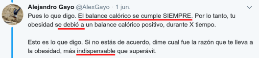 No puede haberlo, porque todos sabemos que de una correlación se puede deducir causalidad (ver). No puede haberlo, porque todos sabemos que de una tautología se puede deducir causalidad (ver). No puede haberlo, porque este «razonamiento» es el que se lleva aplicando los últimos 120 años para tratar de prevenir y combatir la obesidad. No puede ser un razonamiento estúpido porque eso significaría que se está intentando prevenir y combatir la obesidad con una hipótesis inválida confundida con una ley de la física, es decir con pseudociencia.