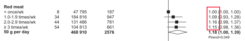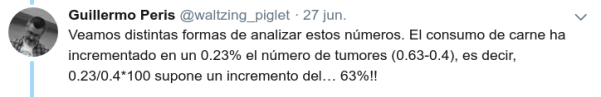 Cogiendo los datos de la gráfica anterior, supongamos que consumimos carne roja menos de una vez a la semana (HR=1.00). Si cambiamos de hábitos y pasamos a consumir carne roja más de tres veces a la semana (HR=1.15), eso no necesariamente aumenta nuestra probabilidad de desarrollar cáncer colorrectal. Hablar de que «aumenta el riesgo» es sencillamente engañar a la gente: falacia de ambigüedad en la que se usa la palabra riesgo para dar a entender algo que es falso.