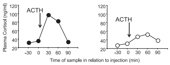 Se les inyecta adrenocorticotropina (ACTH) y se observa la respuesta del cortisol. Se identifican ovejas con alta respuesta (HR) y baja respuesta (LR). Respuesta de las HR en parte izquierda, de las LR en parte derecha: