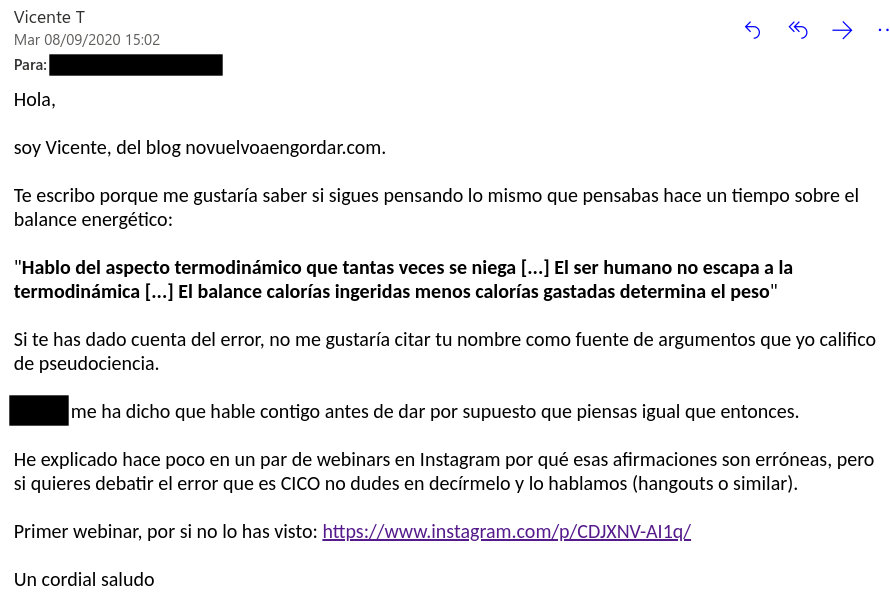 NOTA: en su momento Javier ya le preguntó si la posibilidad de que el gasto energético se adapte a lo que hace el tejido adiposo era una «explicación mágica» que violaba alguna ley de la física. ¿Acaso no entendió la pregunta? No respondió. Ahora dice que lo que Javier le preguntó no viola ninguna ley de la física y aparentemente no se da cuenta de que su nueva afirmación contradice su creencia de que CICO es la primera ley de la termodinámica.