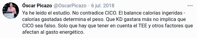 Él dice que sus dos planteamientos no son incompatibles. Ya, o sea que decir que CI-CO siempre es la causa y decir que CO puede ser consecuencia, estando la causa en el tejido adiposo, son compatibles. Sí, claro que sí: CICO es una ley inviolable de la física pero una causalidad distinta de la de CICO es posible. Dice una cosa y la contraria, y pretende tener razón en ambos casos.