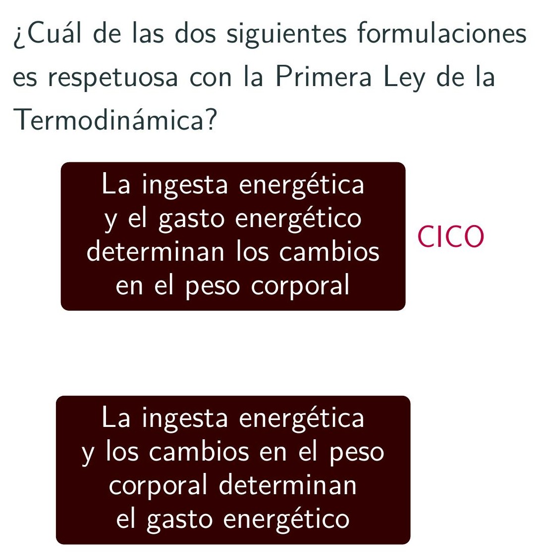 Es decir, que según su primera afirmación lo que causa las variaciones en el peso es CI-CO, y dice que eso lo afirma una ley de la física, pero en la segunda afirmación dice que no tiene por qué ser así, que un fármaco puede afectar directamente al tejido adiposo y CO ser consecuencia, no causa.
