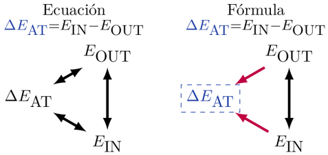 De forma gráfica, mientras que en la ecuación del balance de energía todos los términos se pueden influir unos a otros, en la fórmula CICO se impone un comportamiento arbitrario: el término a la izquierda del signo de igualdad (ΔEAT en la imagen) simplemente hace lo que establecen los términos de calorías entrantes y calorías salientes: