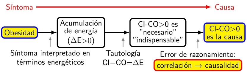 En el estudio de la obesidad, partiendo de la igualdad ΔE=CI-CO (el cambio en la energía acumulada es igual a la diferencia entre la energía entrante y la saliente) se ha rebautizado el síntoma «acumulación de energía» (ΔE>0) como «balance energético positivo» (CI-CO>0) y se ha interpretado el nuevo nombre dado al síntoma como la causa próxima obvia de la obesidad: