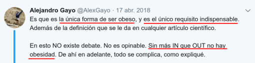 Nótese que de la misma forma que no se puede diagnosticar esquizofrenia a alguien que no tiene los síntomas que definen la esquizofrenia, no se puede diagnosticar obesidad a alguien que no tiene excesiva acumulación de grasa corporal. La acumulación de grasa es el síntoma que define la obesidad, que es la condición física que hay que explicar. La obesidad no es la explicación, es lo que hay que explicar.